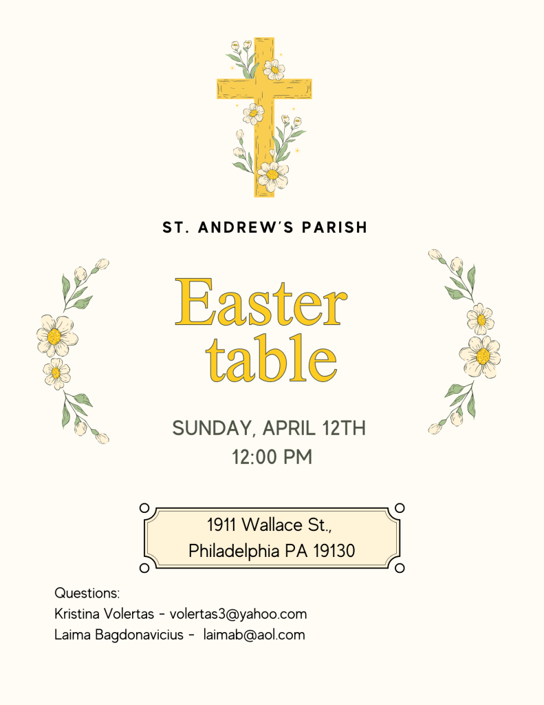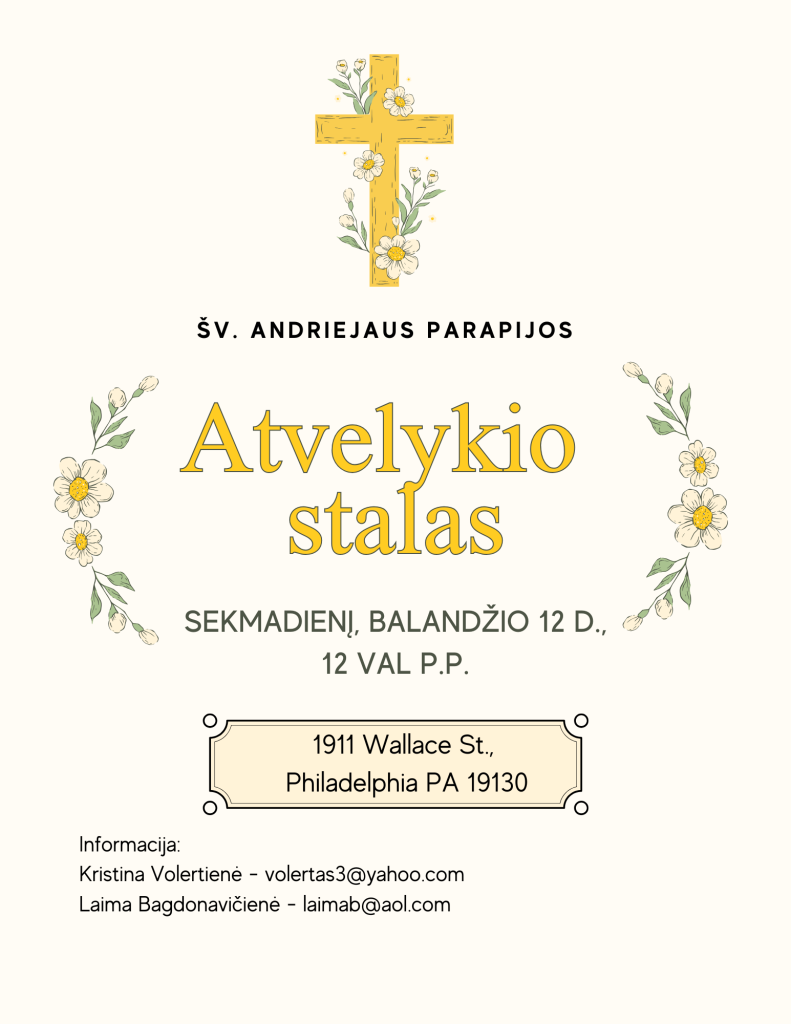 The parish council in collaboration with the Philadelphia chapter of the Lithuanian American Community will host a lunch on April 12 following the 11 AM Mass in the St. Andrew’s church hall. There will be no tickets but the will be a donation basket (suggested donation 10./person, children are free). Anyone wishing to contribute to the food may contact Laima or Kristina (see attched flyers).